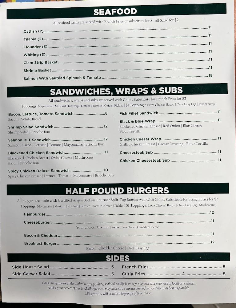 Seafood lovers will appreciate the selection of fish, from flounder to clam strips. Sandwiches and wraps cater to those looking for a hearty meal. Don't miss their half-pound burgers, ideal for anyone with a big appetite.